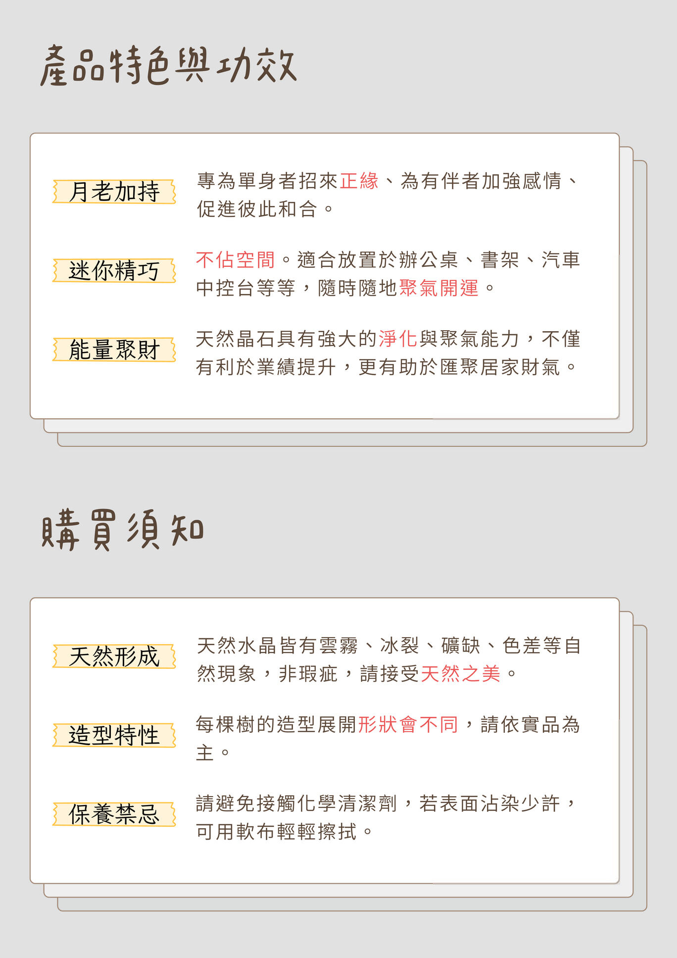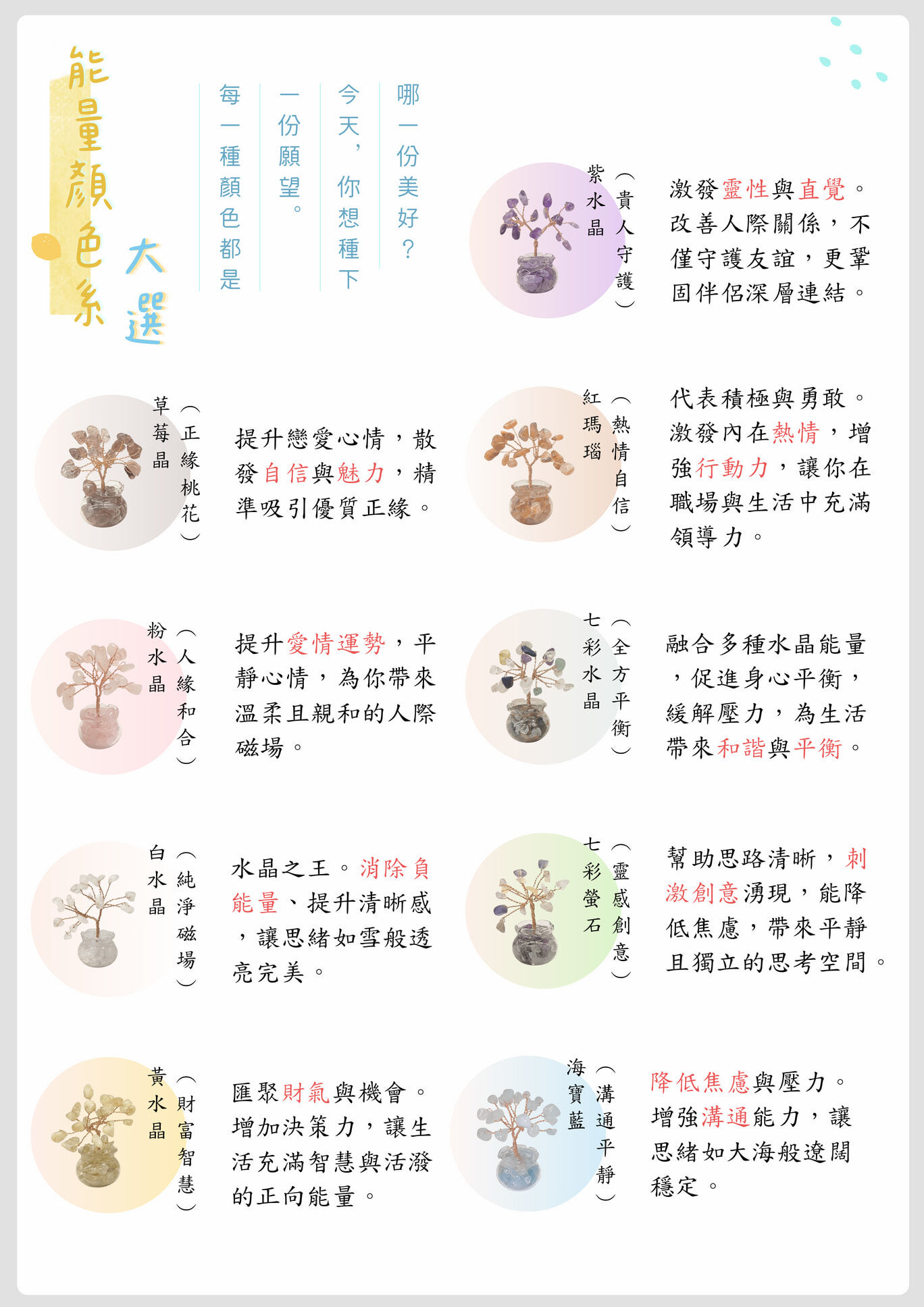 每一棵迷你水晶樹,都是一個微縮的開運磁場。 我們將手工纏繞的銅線枝幹植入晶瑩剔透的小玻璃罐中,底部鋪滿碎石能量土壤,象徵「落地生根、開花結果」。5.5cm 的精緻身形,讓月老的祝福能隨身守護,或安靜地綻放在辦公桌、床頭櫃,為空間注入專屬的療癒頻率。