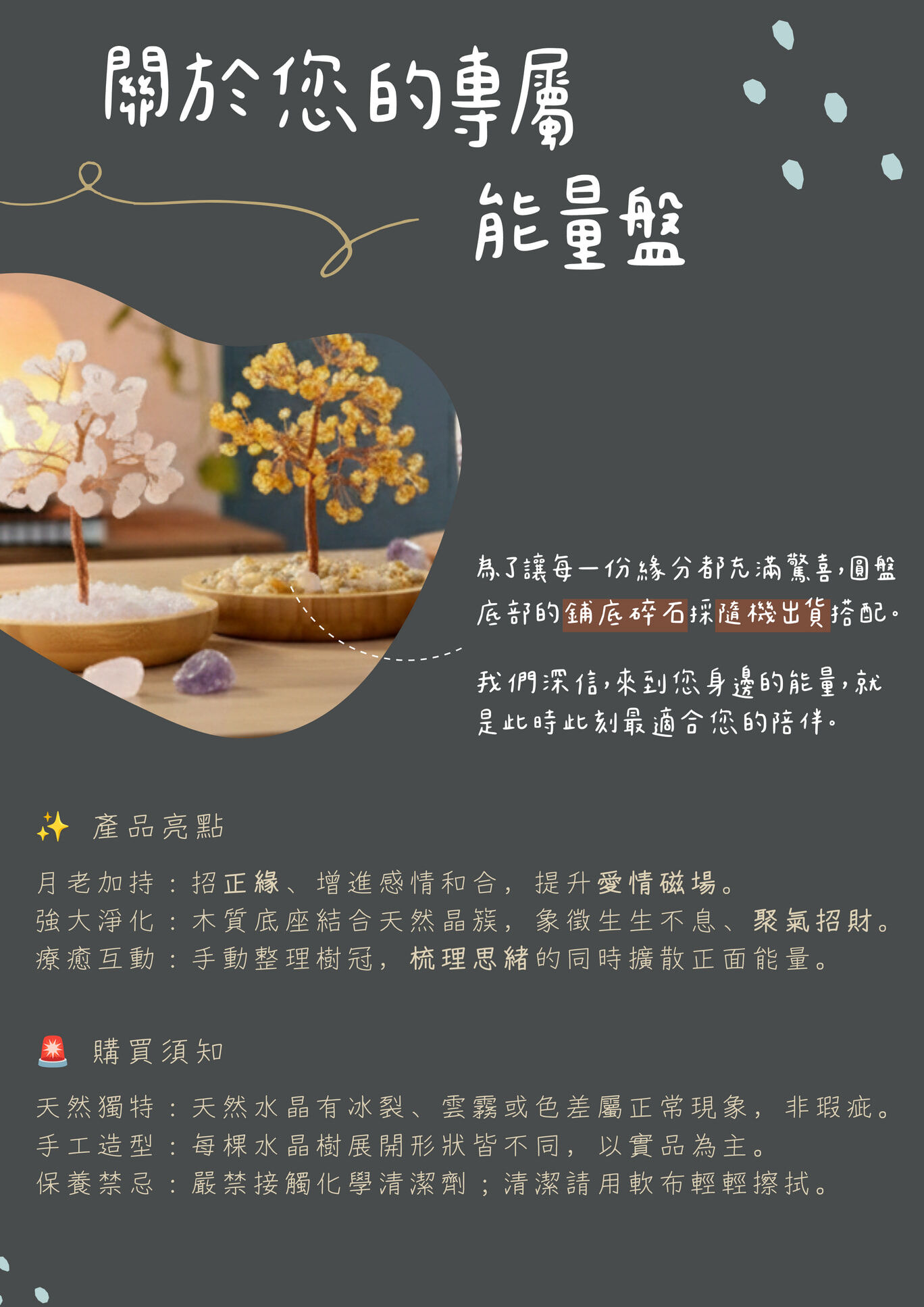 這不只是一棵水晶樹,更是一幅縮小的能量景緻。 我們將手工纏繞的銅線結合開運色系,承載於圓潤的木質托盤中,底部的天然晶簇碎石如同一片能量土壤,持續滋養著你的願望,讓好運自然發生。