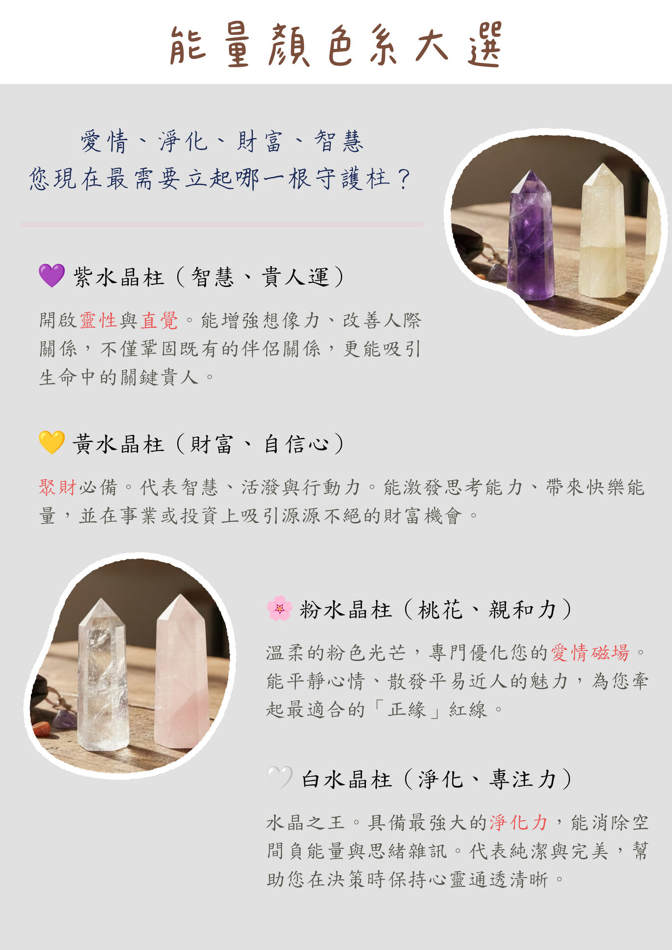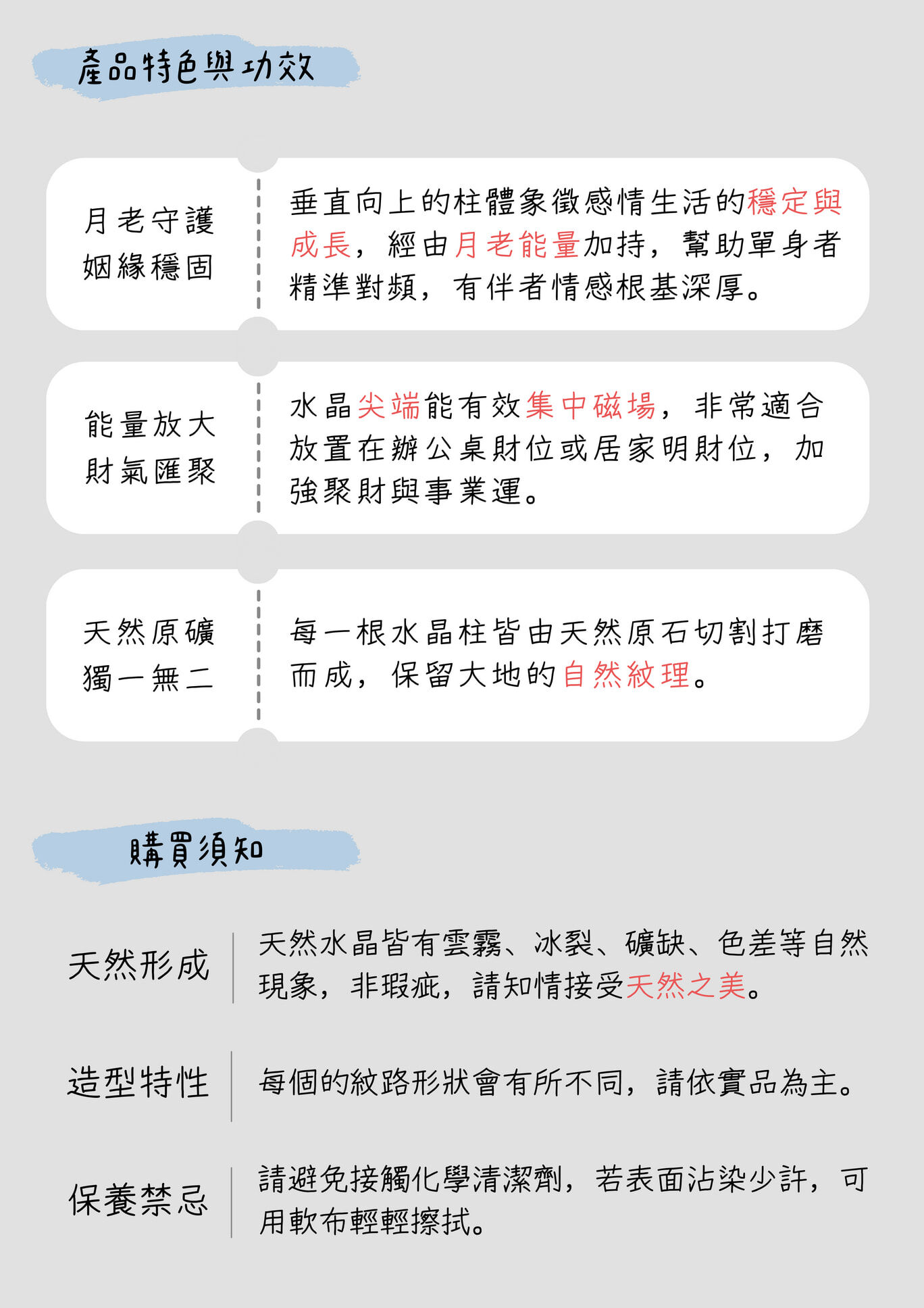 不同於散狀水晶的活潑,水晶柱以其穩固且集中的能量,成為愛情的堅定信物。它像是矗立在您身旁的愛情燈塔,引導正緣靠近,穩定現有關係,讓愛的光芒匯聚成束,照亮彼此相守的道路。